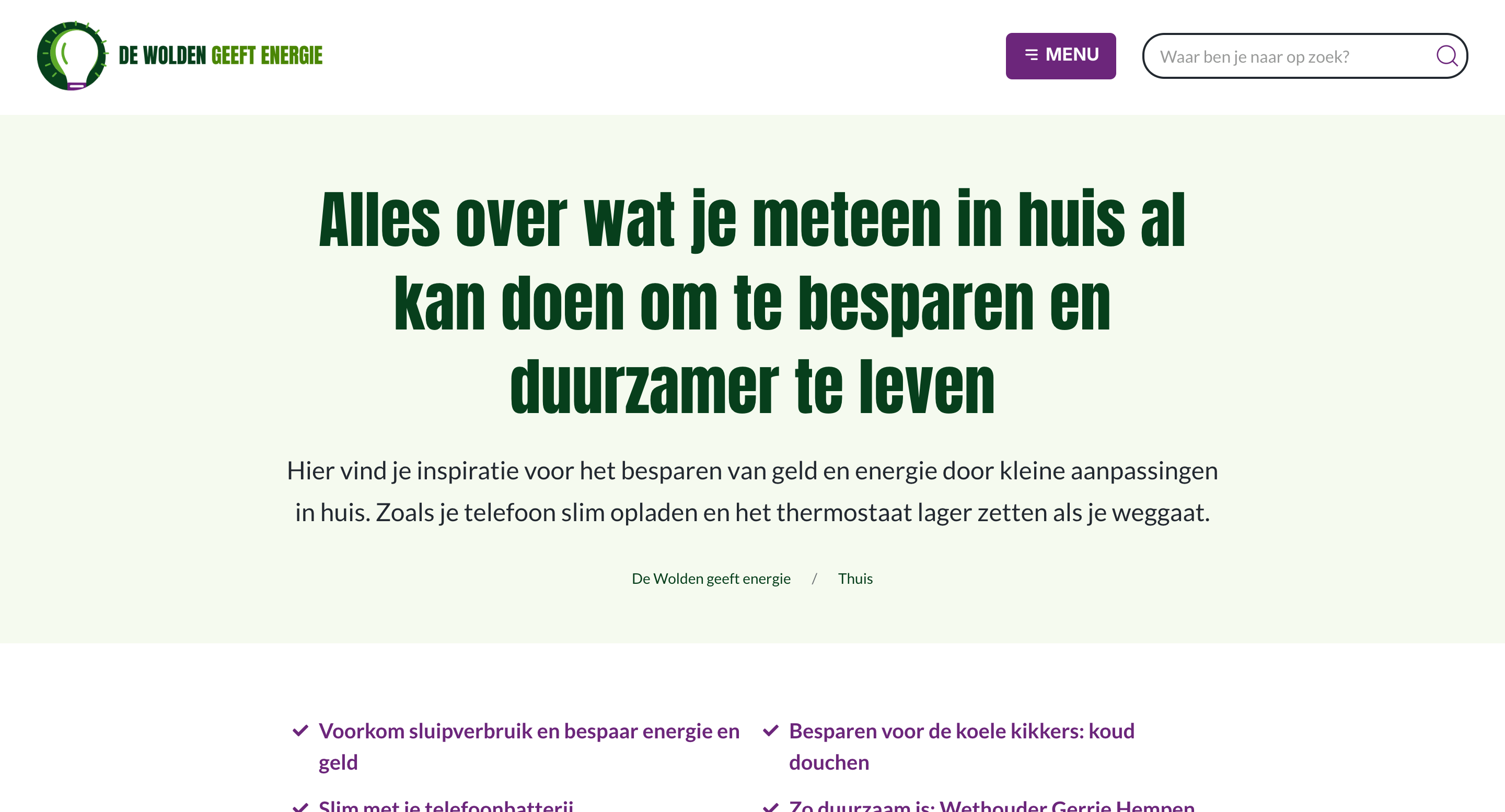 “De Wolden geeft energie” helpt inwoners om stappen te zetten richting een duurzamere toekomst. Omdat tijd en kennis vaak een belemmering vormen om met duurzaamheid aan de slag te gaan, bieden wij een platform dat zowel inspireert als informeert over lokale evenementen en subsidies. Deze nieuwe website, ontwikkeld door Subbs, maakt het voor de inwoners van De Wolden nog eenvoudiger om actief bij te dragen aan een groenere samenleving.